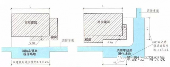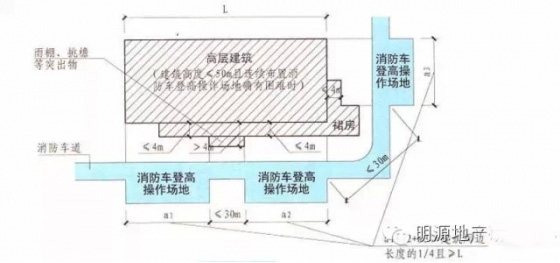 1)高層建筑應至少沿一個長邊或周邊長度的l/4且不小于一個長邊長度的底邊連續(xù)布置消防車登高操作場地,該范圍內的裙房進深不應大于4米;