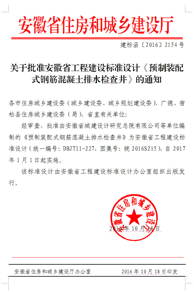 關(guān)于批準安徽省工程建設(shè)標準設(shè)計《預(yù)制裝配式鋼筋混凝土排水檢查井》的通知