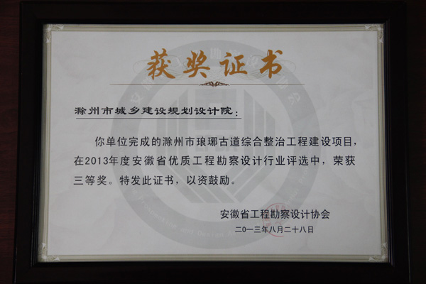 安徽省工程勘察設(shè)計協(xié)會于2013年8月3日組織專家召開安徽省優(yōu)秀工程勘察設(shè)計行業(yè)獎評審會,對全省共62家單位上報的320個項(xiàng)目進(jìn)行了為期兩天的評選。由我院市完成的滁州市瑯琊古道綜合整治工程建設(shè)項(xiàng)目在2013年度安徽省優(yōu)秀勘察設(shè)計行業(yè)評選中,榮獲三等獎。